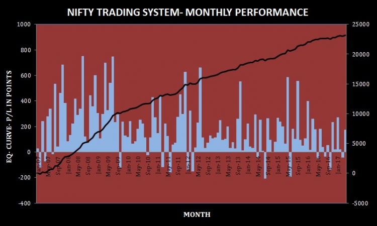 The system has a win- loss ratio of around 60:40 and the back- test results from January 2007 has shown that the system has consistently generated profits of more than 1000 points (1000* 75= 75,000) per annum, year after year. The best performance was plotted in 2009, with profits in excess of 3800 points & the worst yearly performance was in 2014 with profits of 1032 points. Based on our live trading experience, slippages are very, very minimal; around 3- 5 trades a year.