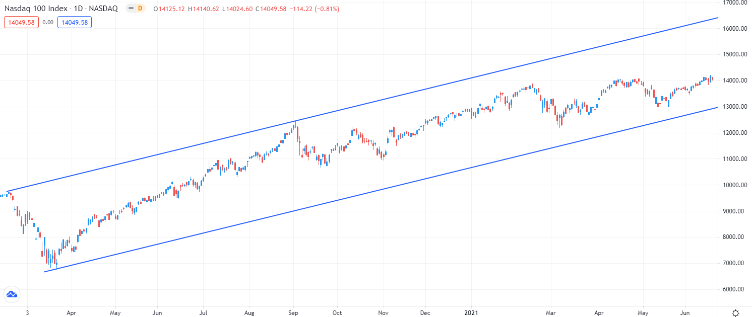 The Nasdaq led the US stock market rally in late March 2020 after the rout in the earlier month following the UN announcement that the COVID outbreak is an international public health emergency. With the acceleration of workspace digitalisation, the technology sector has been one of the biggest beneficiaries of the pandemic. Despite the 30% drop in February-March 2020, the Nasdaq ended the year with gains of over 46% to record one of its best annual feats. Midway through June 2021, the tech index is up 14%, lagging the S&P 500 by a small margin.