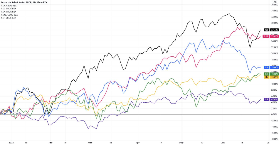 The sectoral chart below shows the performance of the financial (XLF), building materials (XLB), real estate (XLRE), healthcare (XLV), technology (XLK), and the consumer staples sectors (XLP). A close look at the chart from March 2021-June 2021 indicates that the financial, building materials, and real estate sectors outperformed others.