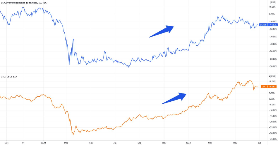The massive stimulus spending by the Fed appears to have led to a surge in inflation. The US Dollar Index has been on a downtrend for the last 12 months. It touched a high of 102 in March 2020 before falling to 90 in May 2021. A weaker dollar is positive for commodity prices, and these have jumped significantly since the March 2020 market crash. Oil, silver, corn, copper, natural gas, and soybean have jumped by a whopping 70% or more from April 2020-June 2021. Oil prices are back to their pre-pandemic levels and could gain further on the back of growing optimism that global economic activity is picking up. At the same time, the impending increase in supply from Iran and the outbreak of COVID in emerging economies are balancing the supply-demand equation.